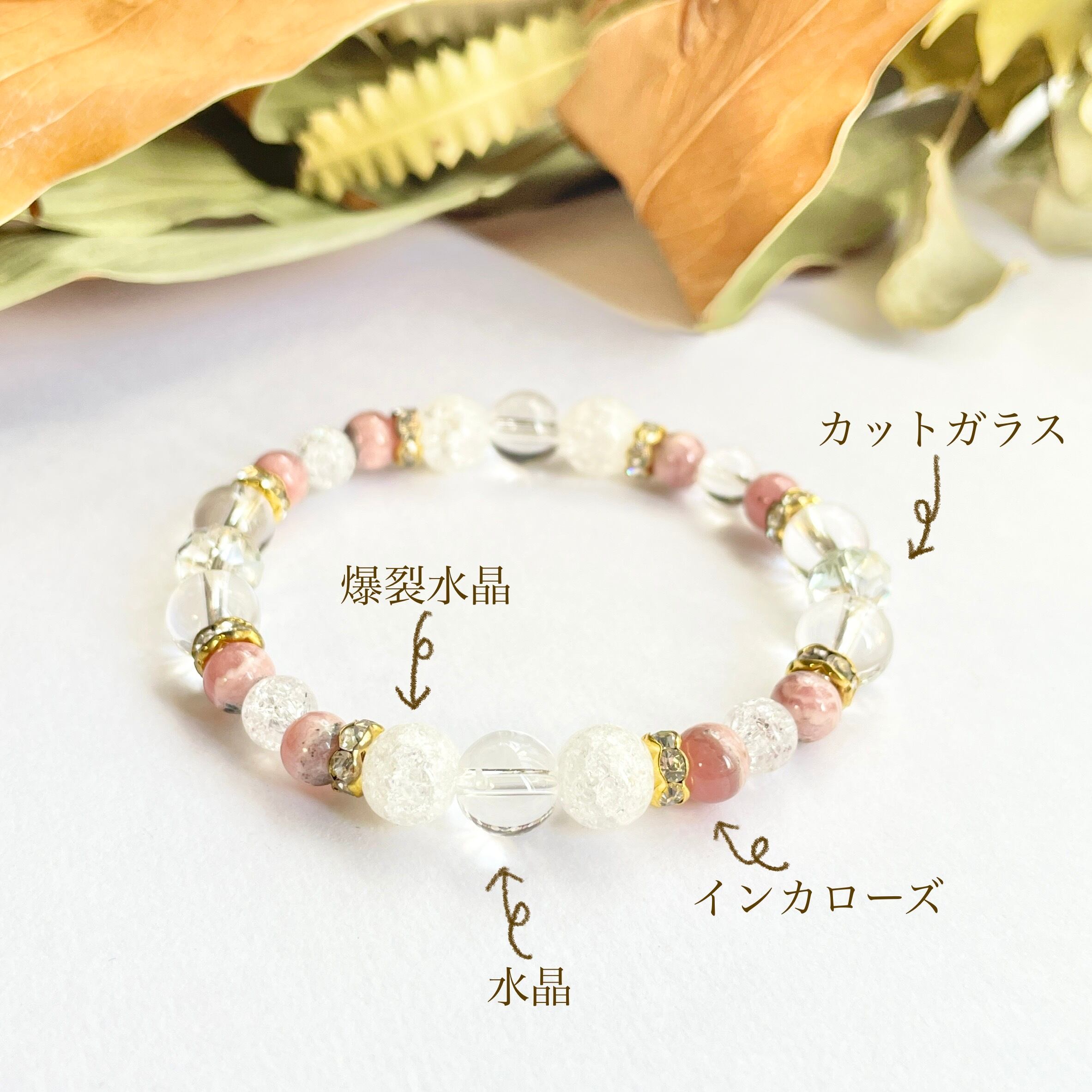天然石デザインブレスレット インカローズ×爆裂水晶×水晶 7月誕生石 ①