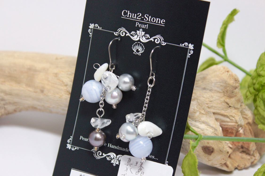 【真珠シリーズ】淡水真珠×ブルーレースアゲート×マザーオブパール×水晶 1点もの サージカルステンレスピアス B-8