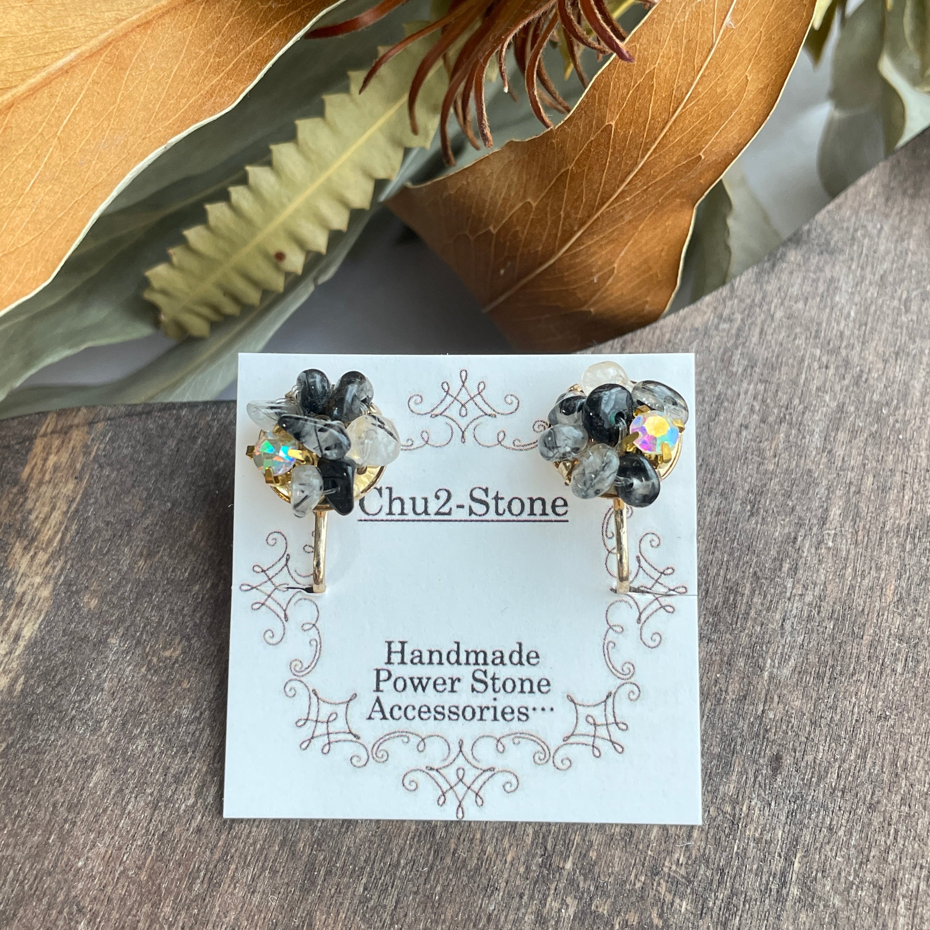 【天然石ビジューイヤリング】トルマリン×水晶 1点もの E−6