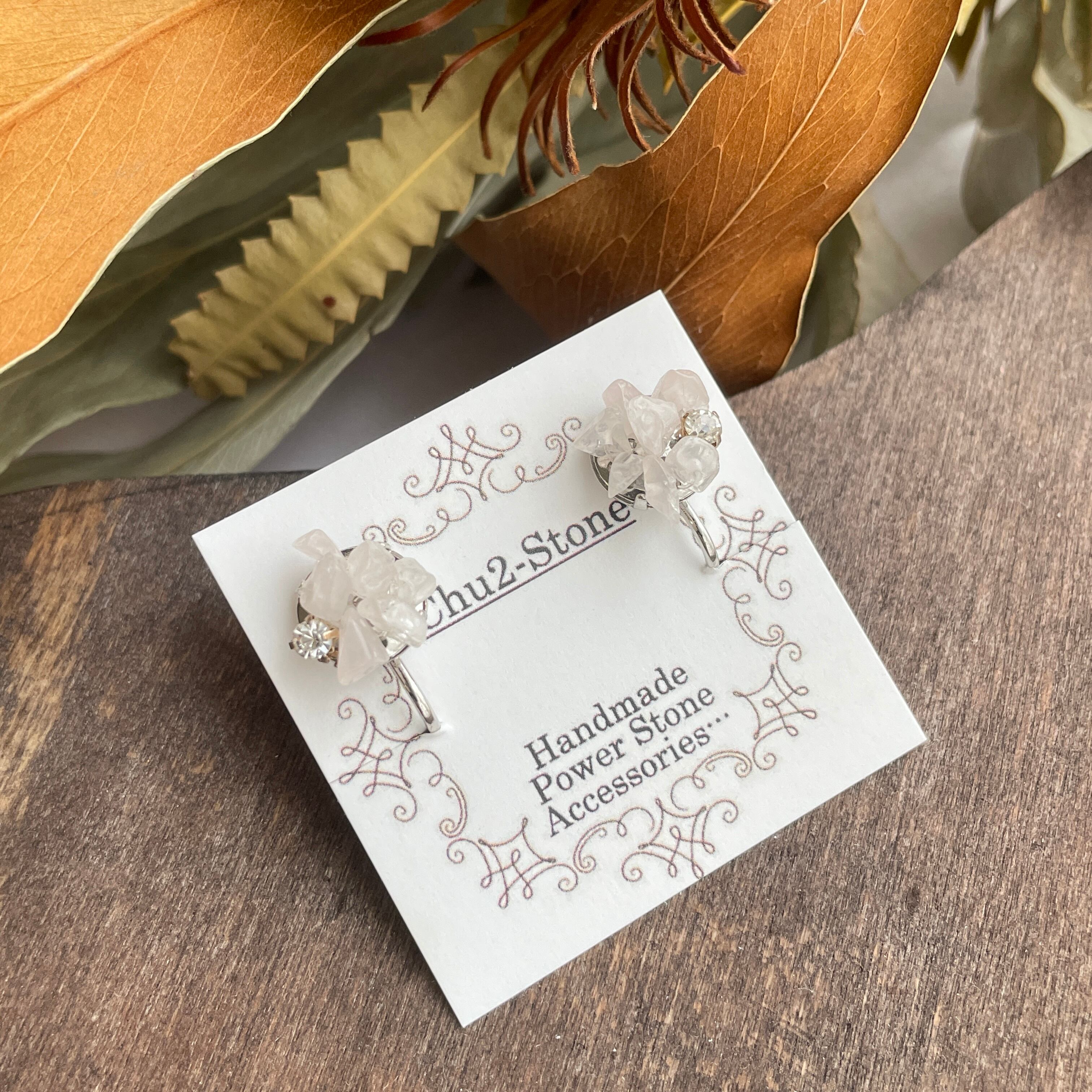 【天然石ビジューイヤリング】ローズクォーツ×水晶 1点もの E−10