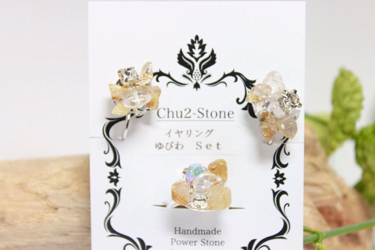 【天然石ビジューイヤリング&指輪セット】ルチルクォーツ×水晶 フリーサイズ 1点もの B-14