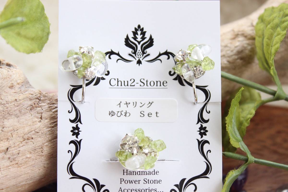 【天然石ビジューイヤリング&指輪セット】ペリドット×水晶 フリーサイズ 1点もの B-21