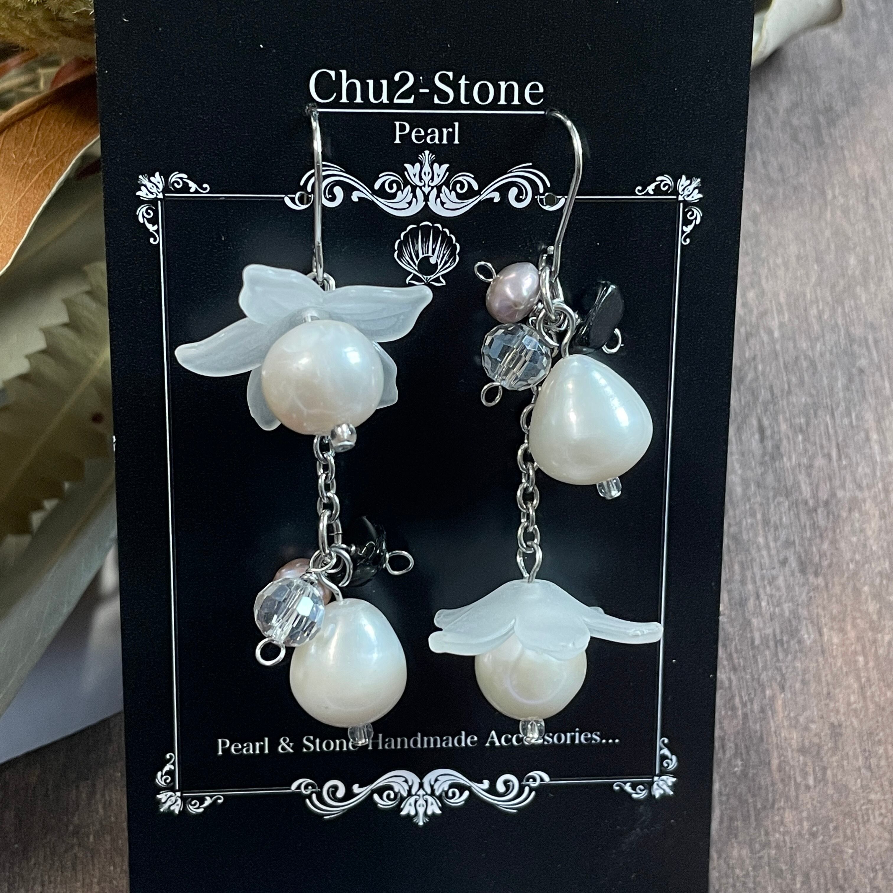 【真珠シリーズ】淡水真珠×黒水晶(モリオン)×水晶 1点もの サージカルステンレスピアス P-21