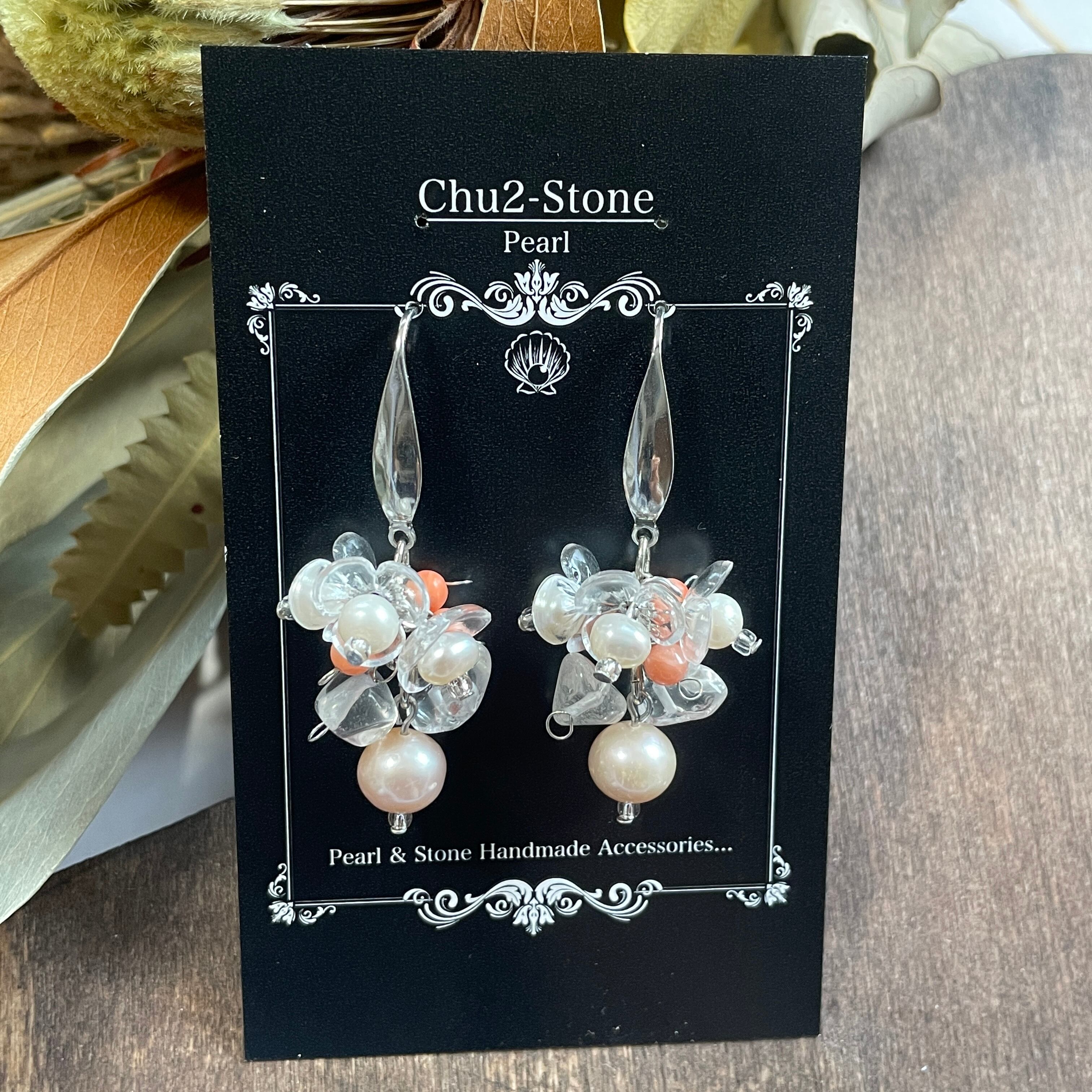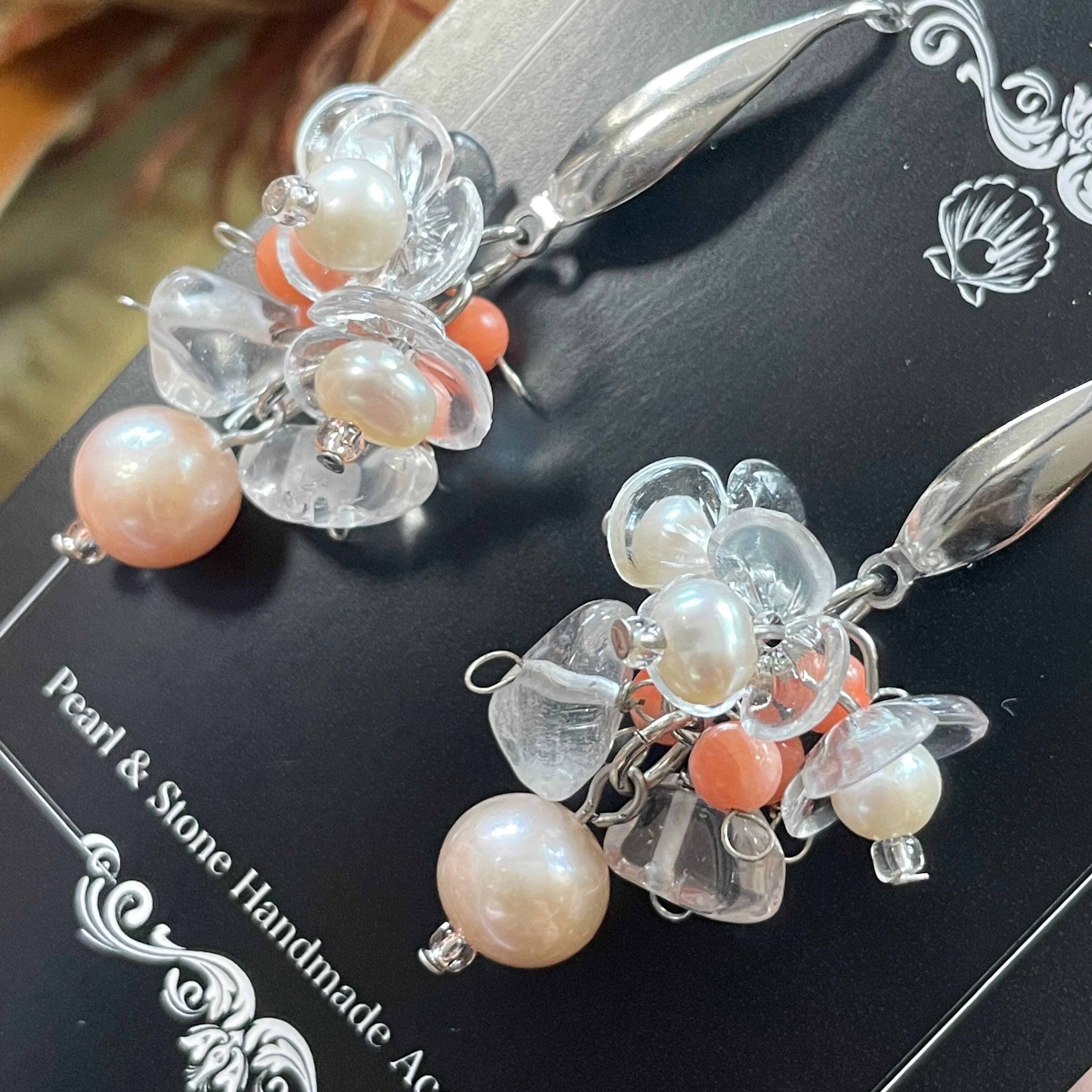 【真珠シリーズ】淡水真珠×サンゴ×水晶 1点もの サージカルステンレスピアス P-27