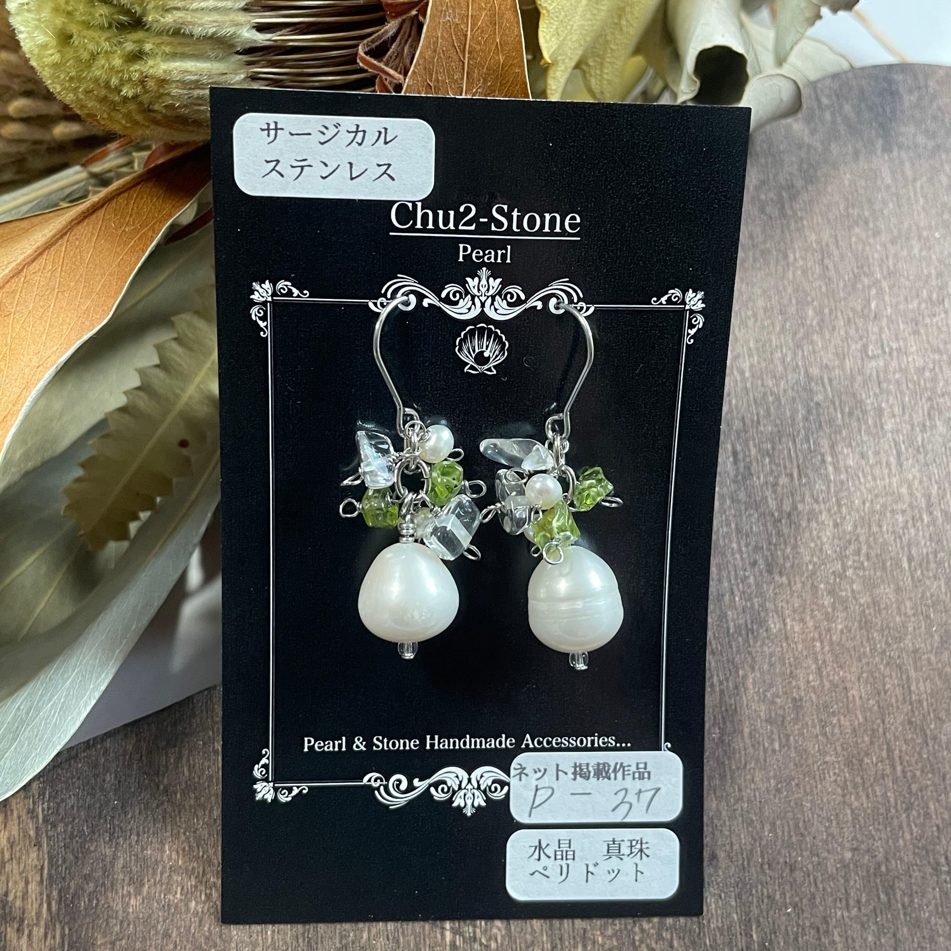 【真珠シリーズ】淡水真珠×ペリドット×水晶 1点もの サージカルステンレスピアス P-37