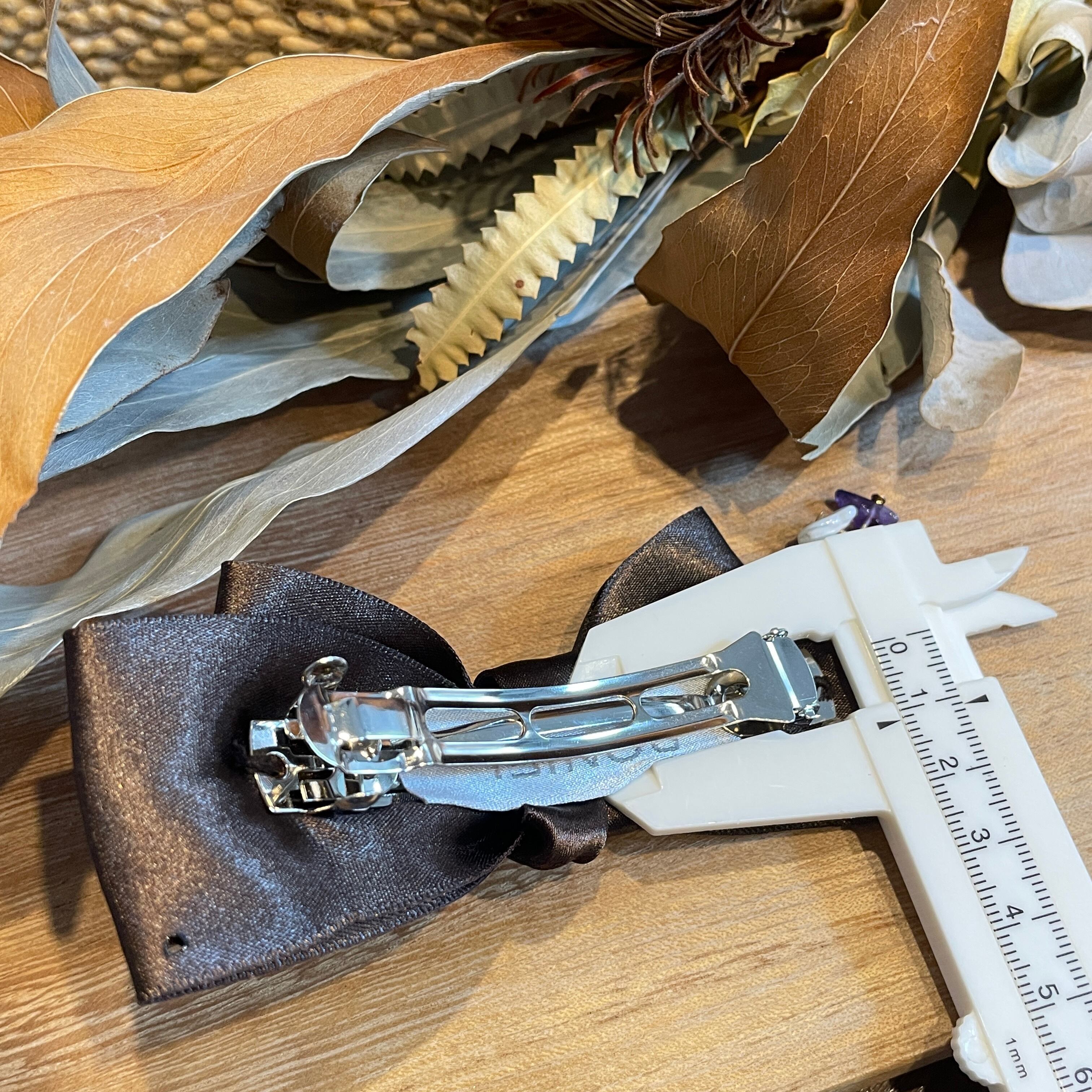 天然石リボンバレッタ アメジスト×マザーオブパール×水晶 H-1