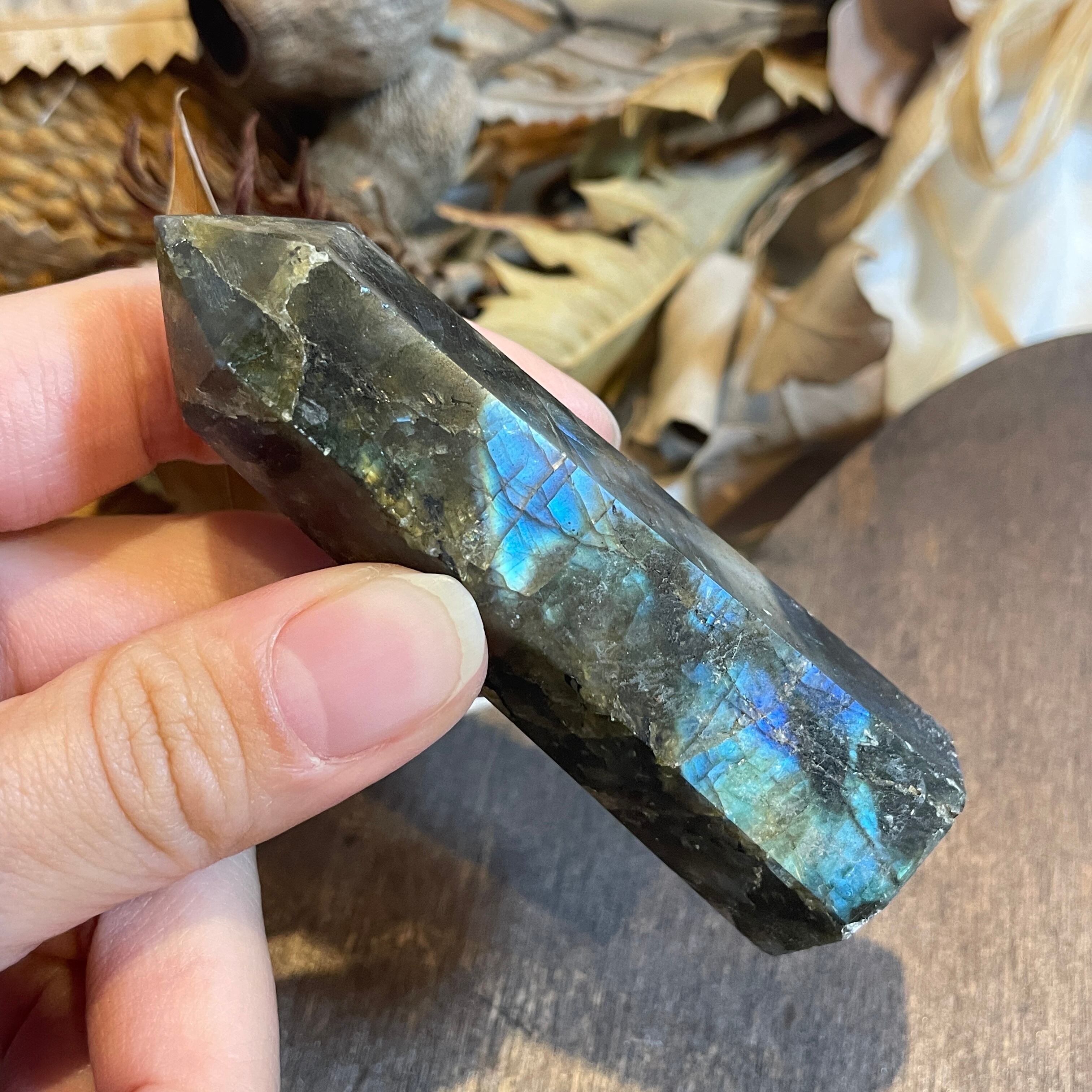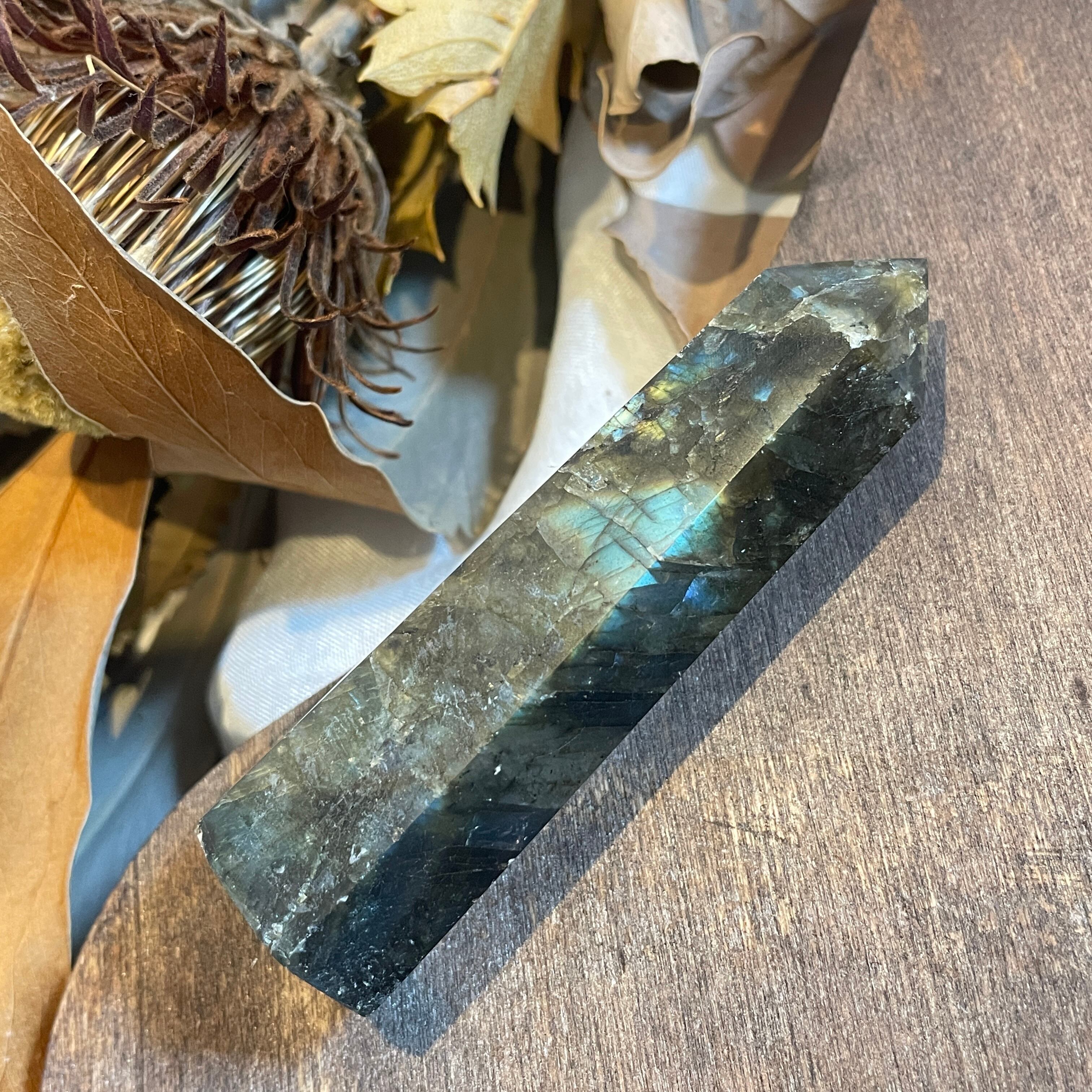 ラブラドライトは光の角度によって特有の光沢と内部の色の変化があります。