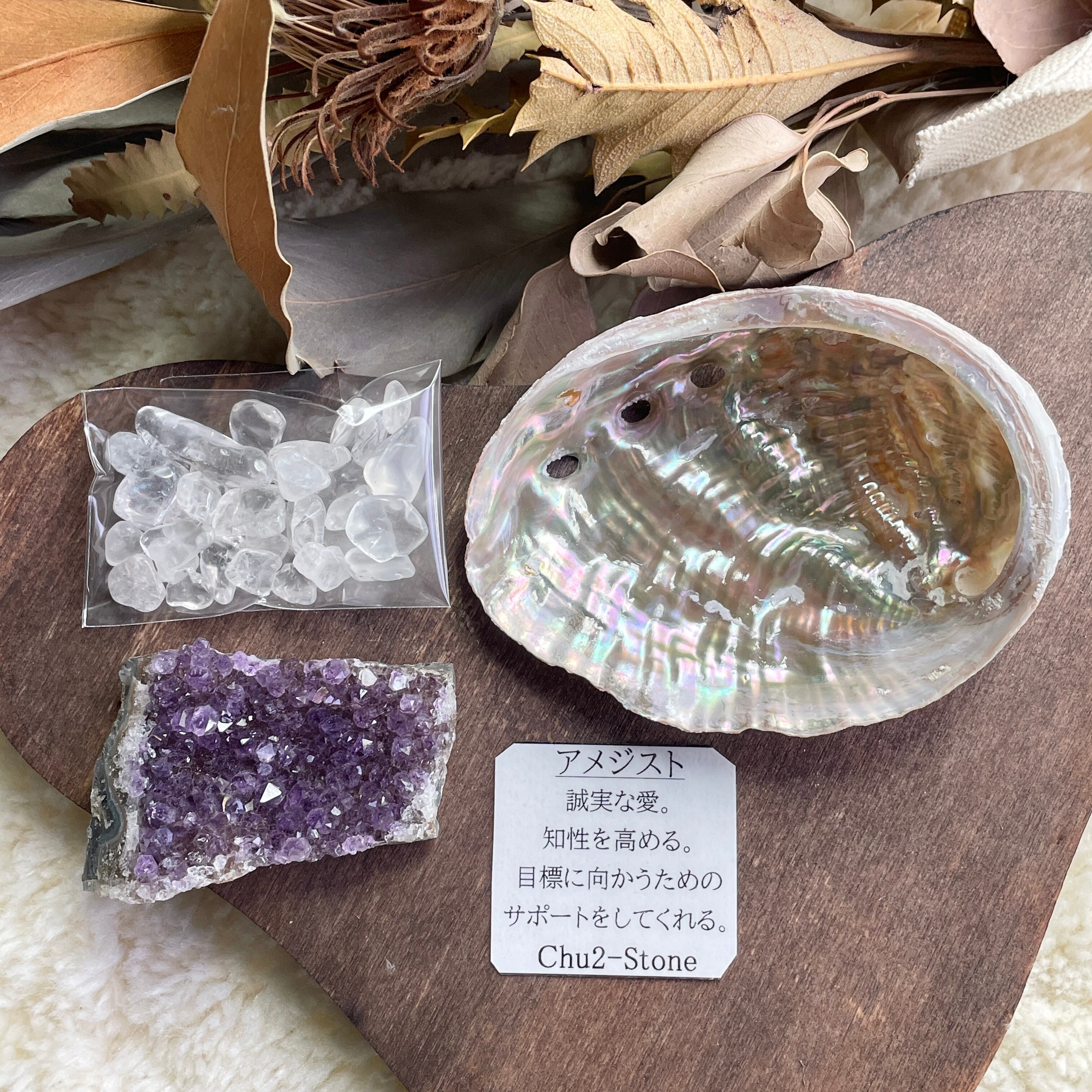 【天然石インテリア】アメジスト×アバロンシェル 意味カード&水晶のさざれ付き 浄化などにもオススメ T-17