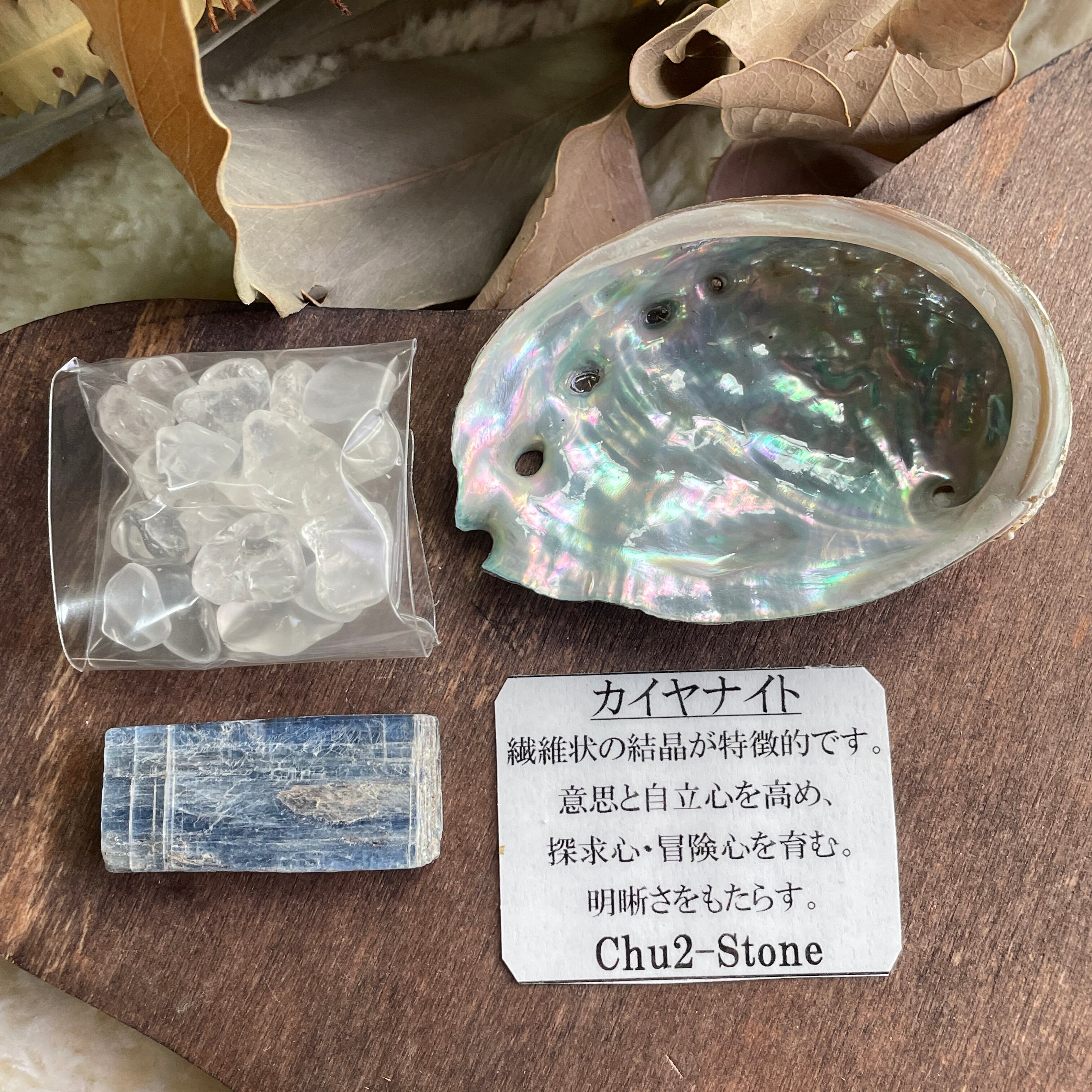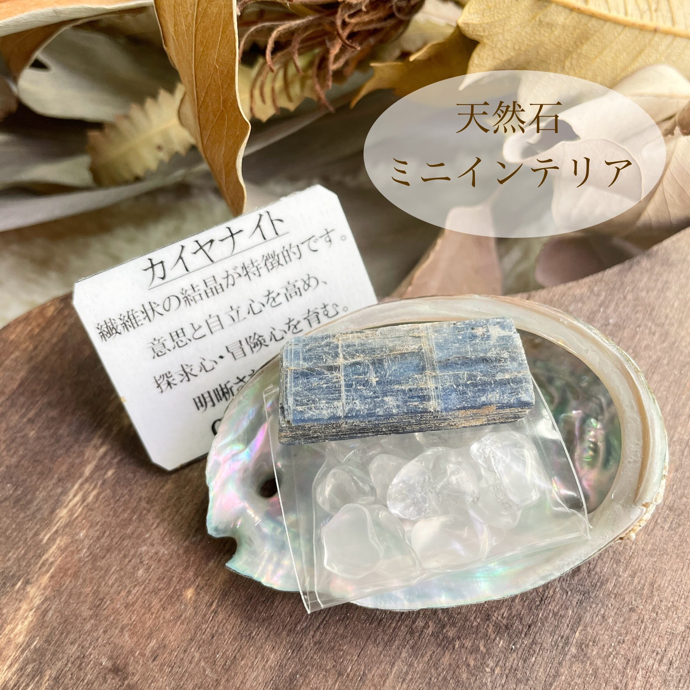 【天然石インテリア】カイヤナイト×アバロンシェル 意味カード&水晶のさざれ付き 浄化などにもオススメ T-19