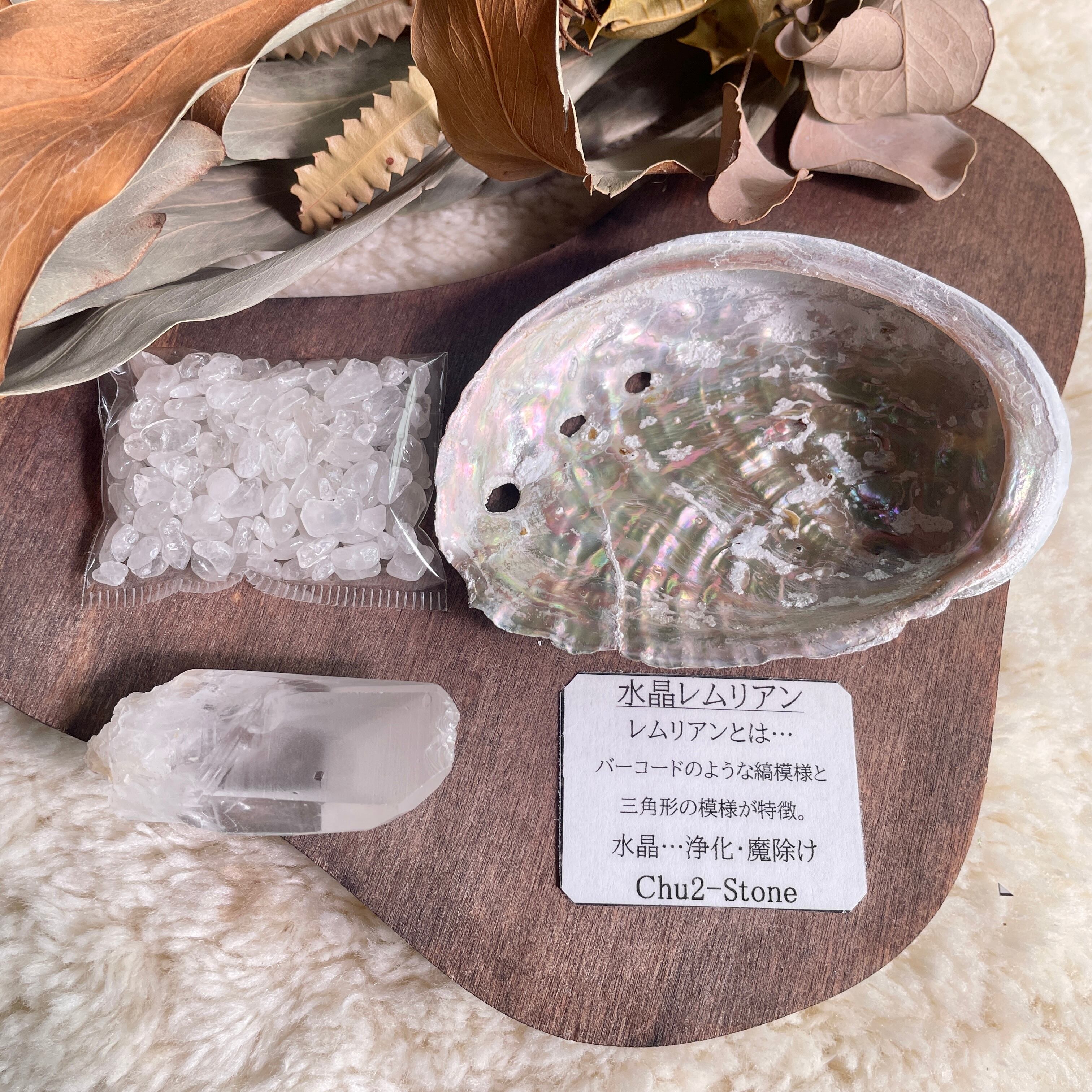 【天然石インテリア】 水晶レムリアン×アバロンシェル 意味カード&水晶のさざれ付き 浄化などにもオススメ T-61